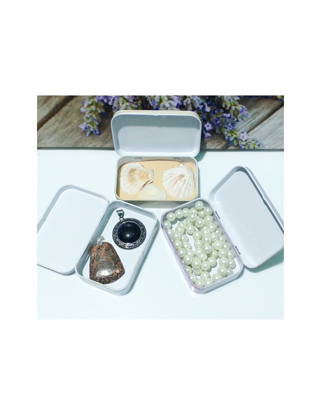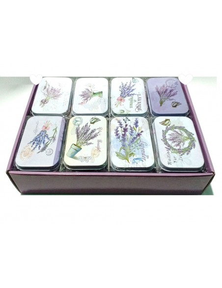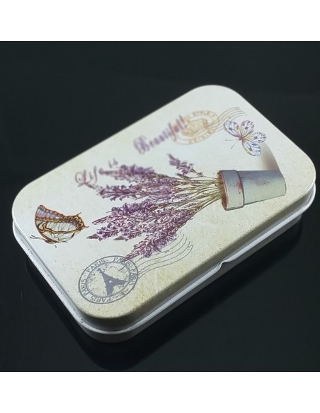 Cutie metalica dreptunghiulara pentru ambalare cadou bijuterii, sapun manual sau diverse obiecte mici. Decor lavanda.