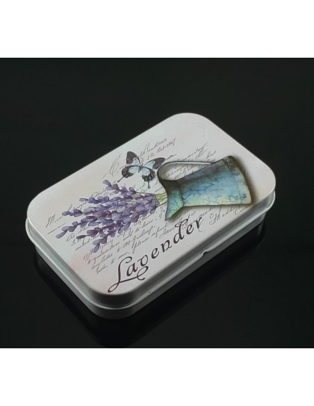 Cutie metalica dreptunghiulara pentru ambalare cadou bijuterii, sapun manual sau diverse obiecte mici. Decor lavanda.