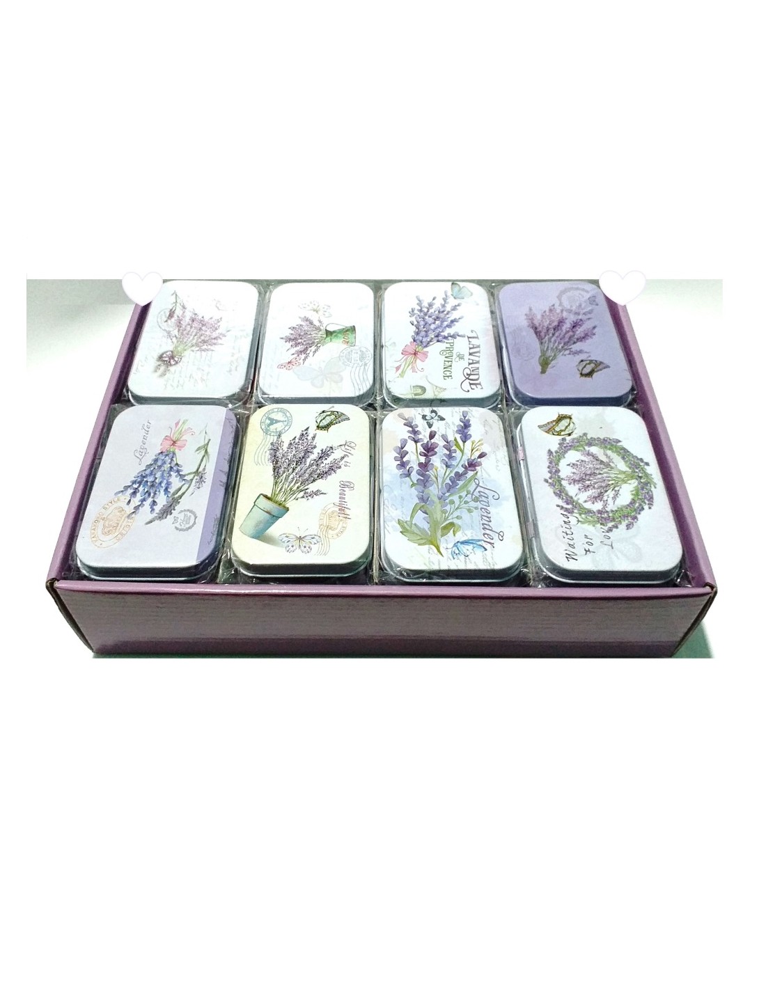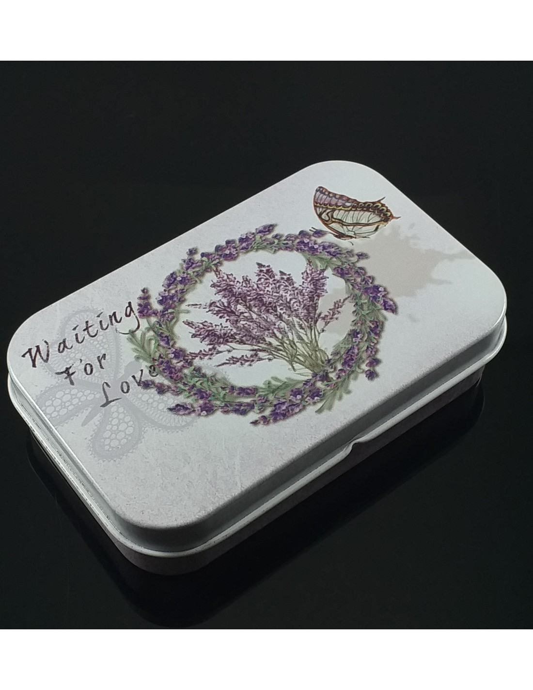 Cutie metalica dreptunghiulara pentru ambalare cadou bijuterii, sapun manual sau diverse obiecte mici. Decor lavanda.