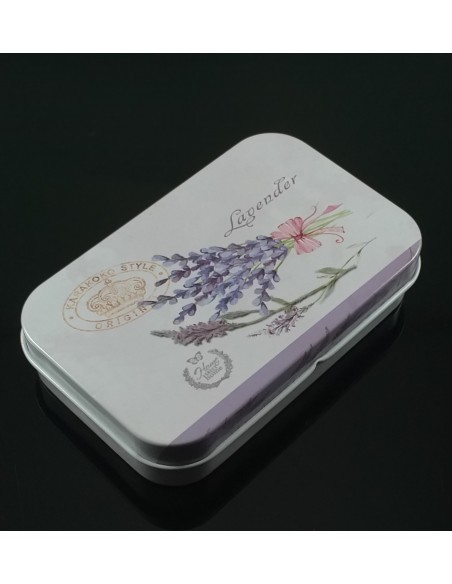 Cutie metalica dreptunghiulara pentru ambalare cadou bijuterii, sapun manual sau diverse obiecte mici. Decor lavanda.