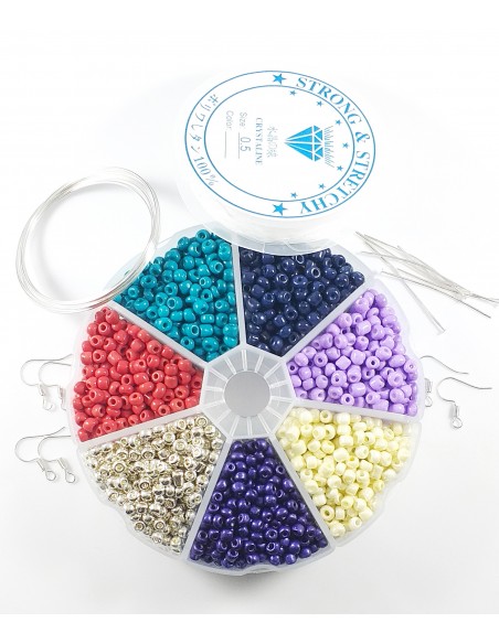 Kit compus din 2300 margele (aprox. 210 grame), accesorii metalice argintii, 10 spire sarma cu memorie (pentru bratari), 1 rola de guta elastica, utile pentru confectionare bijuterii (cercei, bratari, pandantive)